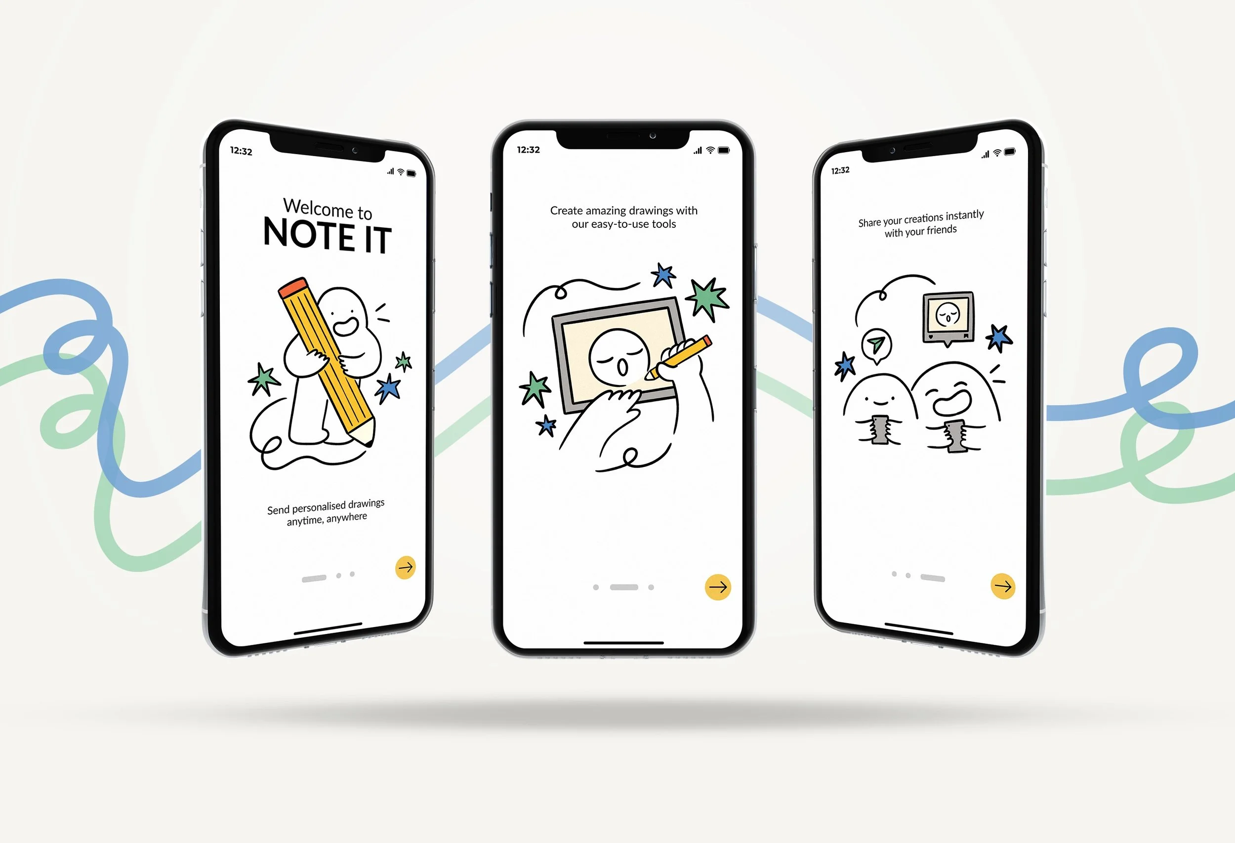 NOTE IT is an interactive app that lets you create, share, and receive drawings from friends and creators all around the world. The branding of NOTE IT features a clean, minimalist illustration style characterised by simple linework, making it a fresh and welcoming space for artistic expression.