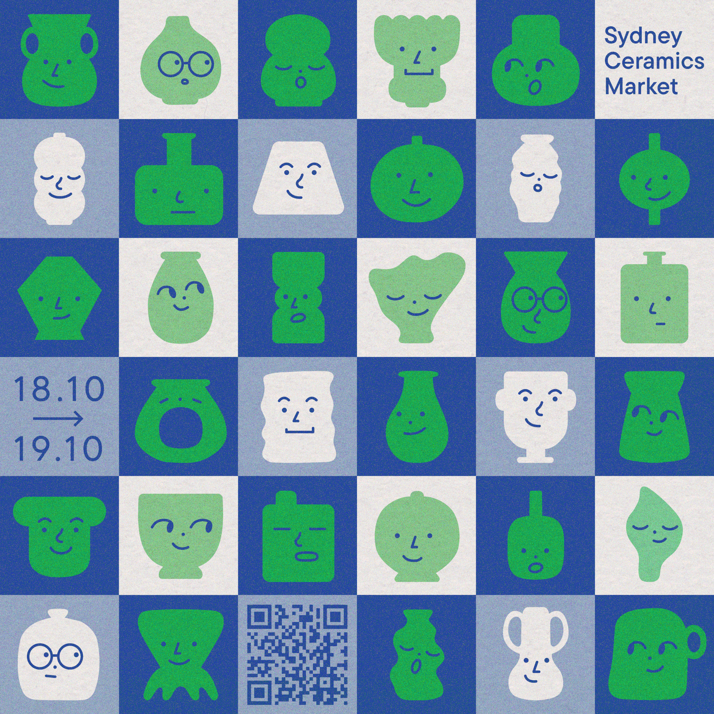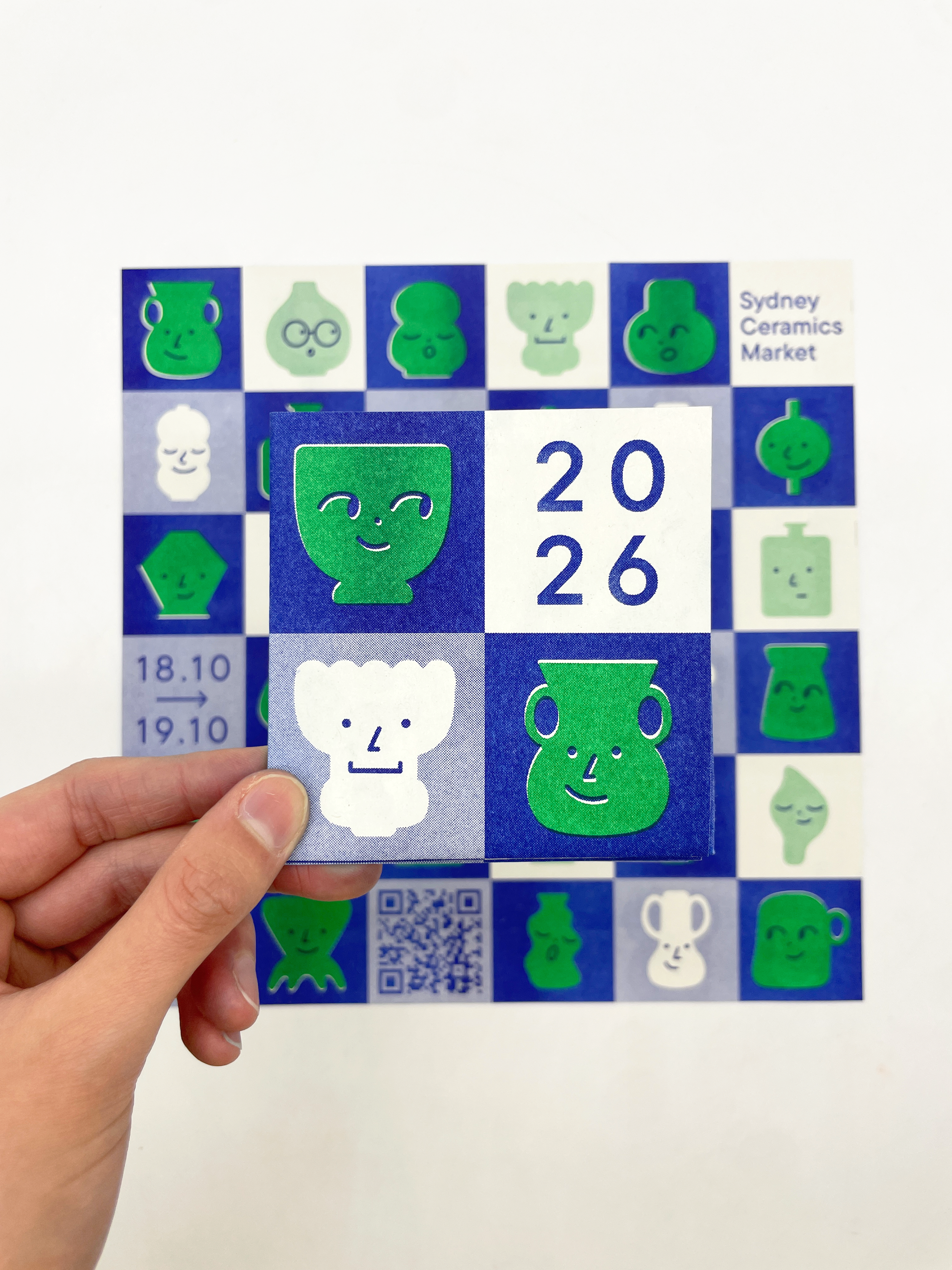 This poster was risograph printed – a deliberate choice that complements the handmade nature of ceramics. Like ceramics, risograph printing embraces imperfection, uniqueness and the textured aesthetic. This tactile, character-rich aesthetic aligns closely with the values and mission of the Sydney Ceramics Market which is to celebrate the artistry and authenticity of handmade ceramics.